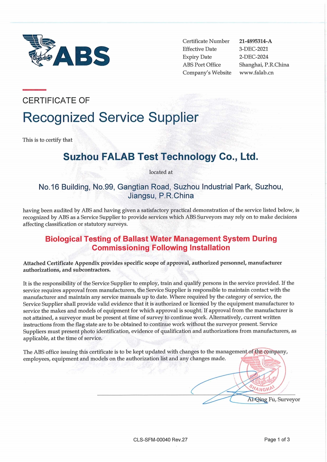 FALAB has successfully passed the accreditation of ABS ballast Water Management Commissioning Test (BWMS) since ABS released the Ballast Water Treatment Guide 2021 last year. FALAB has passed the test of international standards and enhanced its business capabilities. FALAB can provide professional ballast water testing services for ABS customers all over the world.