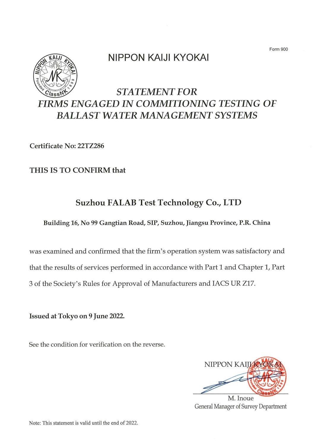 華碧(FALAB)獲得日本船級社(NK)資質及其他資質證書的查詢網址: