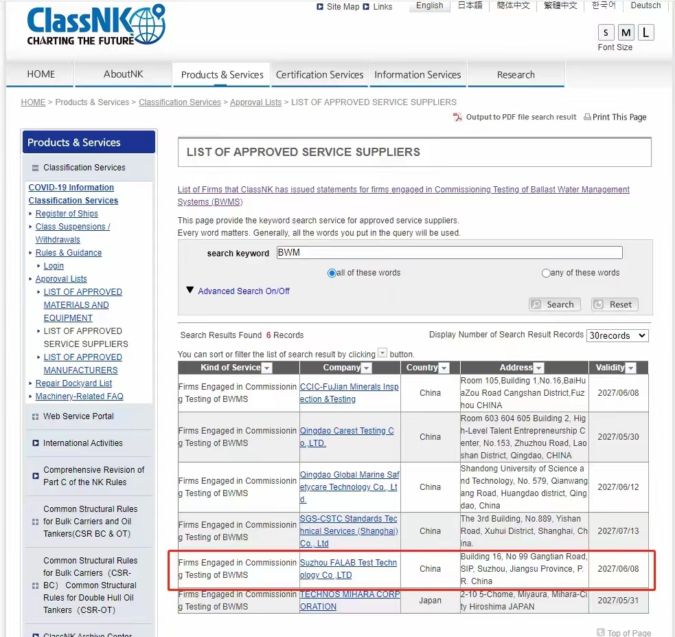 6月中,華碧(FALAB)獲得了日本船級社(NK)壓載水檢測服務供方認可證書,成為國內首批獲得日本船級社船舶壓載水檢驗認可的第三方檢測機構,屆時可為ClassNK的全球客戶提供壓載水管理系統(BWMS)調試試驗服務。
