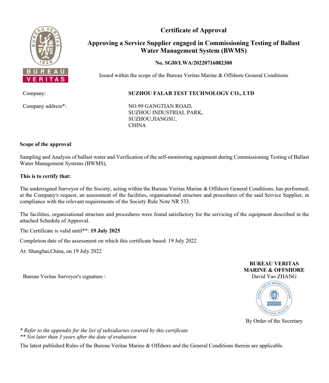 7月中旬,華碧(FALAB)通過了法國船級社(BV)的認證,成功取得其壓載水管理系統(tǒng)調(diào)試試驗(BWMS)資質(zhì)認可,提升了華碧(FALAB)在壓載水檢測領域的服務能力。