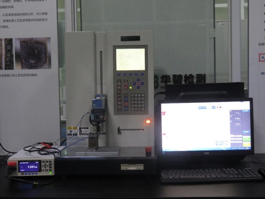 自主開發的正向力vs. 接觸電阻測試系統:高精度測量系統,配備了高精度微歐姆級電阻測試儀,位移分辨率為1微米的荷重測試儀 。可以完成各種端子的小位移正向力性能測試。