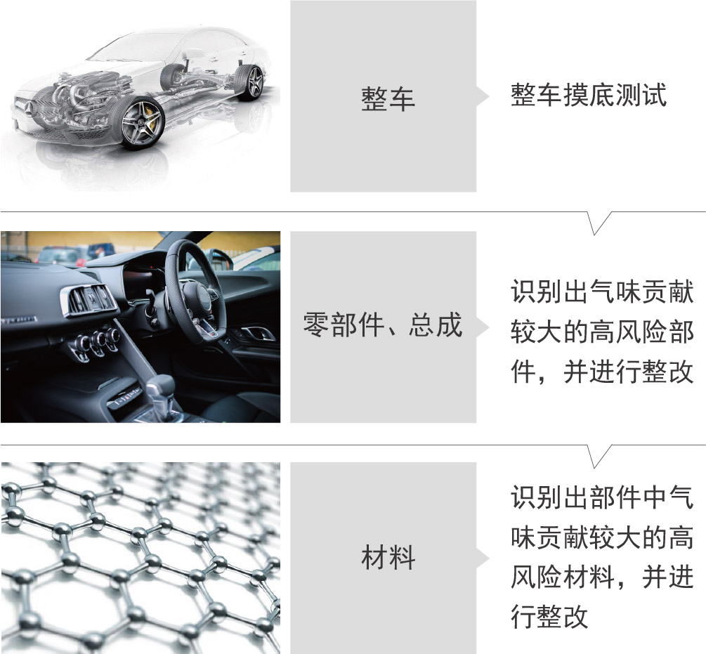 通過整車特定部位小范圍加熱測試其揮發物,確定重點總成;重點總成與重點材料均經過常溫、高溫測試。